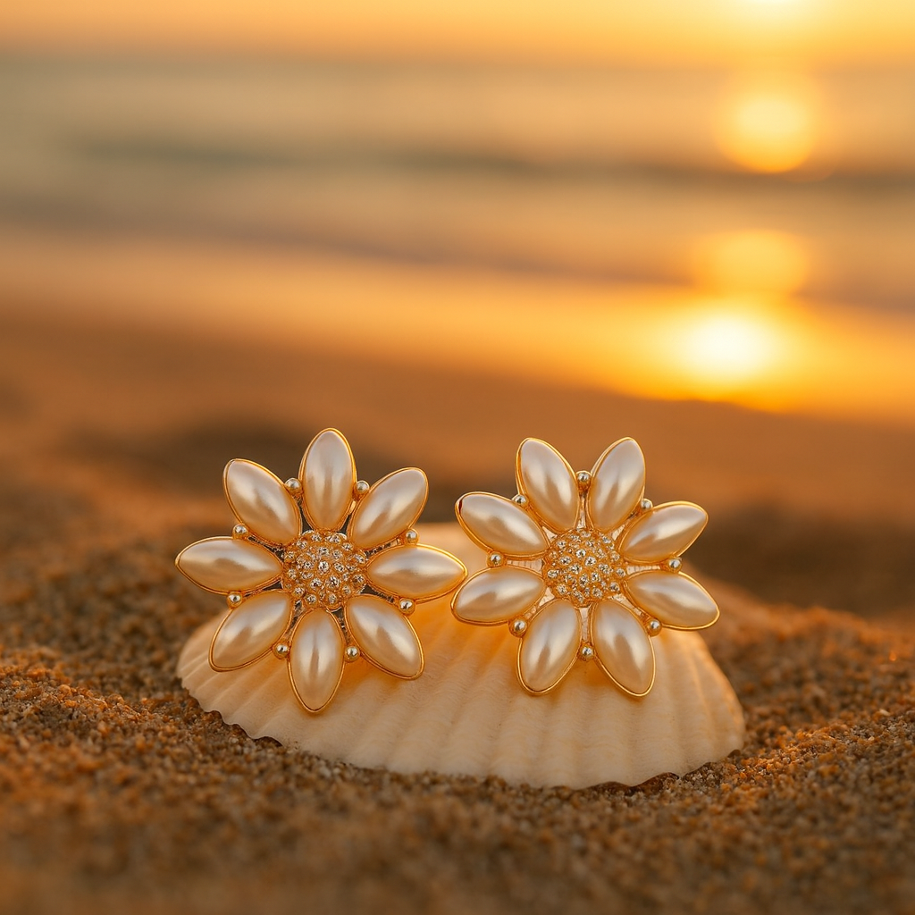 Ces boucles d’oreilles dorées en forme de fleur offrent une allure raffinée et lumineuse. Chaque pétale en perle apporte un éclat délicat, souligné par un centre texturé doré pour une touche sophistiquée et féminine.