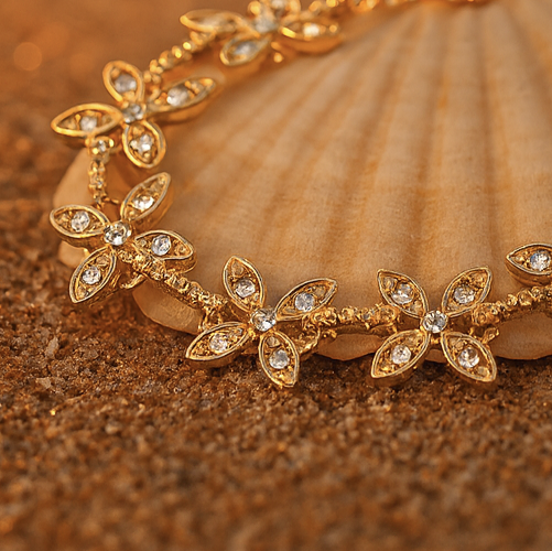 Un bracelet doré élégant, composé d’une succession de fleurs serties de cristaux scintillants. Son design raffiné et harmonieux offre une touche de lumière subtile au poignet.